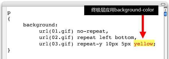 所有的元素只能定义一个背景颜色,background-color所在的层被赋予为最底层,称之为“终极层(final layer)”。background-color层在所有的background-image层之下。