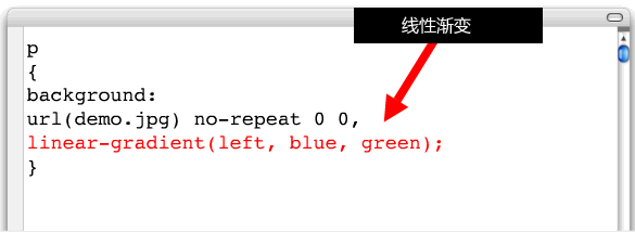 Multiple backgrounds和渐变要有这种意识:渐变是一种代码生成的图片。他们可以使用url()值来代替。这就意味着你可以在多背景中使用渐变,例如下面展示: