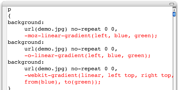 如果你在多背景中添加前缀属性会怎样的?浏览器会无视其不认识的CSS,因而,这里整行声明都不起作用。私有的前缀属性只能被特定的浏览器识别,我们不能再同一个声明中添加浏览器私有前缀,因为浏览器会忽视整个声明,这就意味着我们不得不为每个特定的前缀属性写个background属性。所有其他的背景图片都必须包含在每一个声明中。例如:
