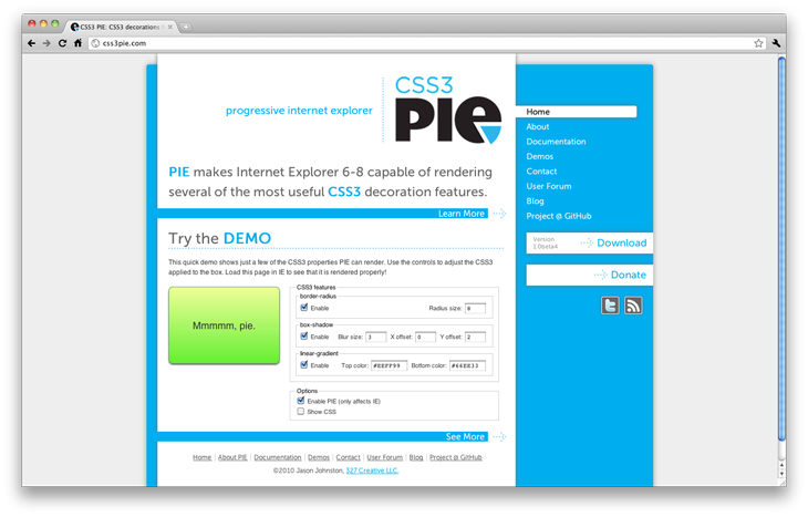 使用CSS3 Pie可以让IE6至IE8版本实现大多数的CSS3修饰特性,如圆角、阴影、渐变等等。→ 访问 CSS3 Pie