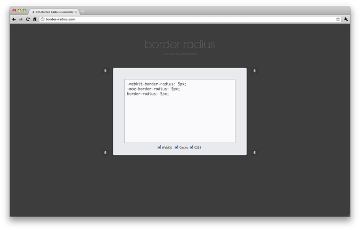 一款在线CSS3圆角工具,四个角输入值就能生成对应的效果和代码。→ 访问 Border Radius.com