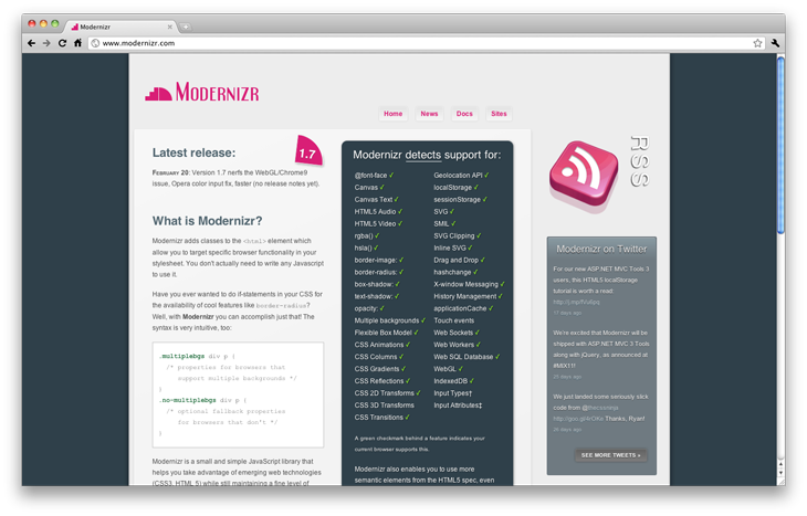 一个非常有用的用于 CSS3 和 HTML5 特性检测的JS库(需要翻墙)→ 访问 Modernizr