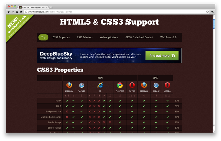 一个非常不错的HTML5 & CSS3 兼容性在线检测网站。→ 访问 HTML5 & CSS3 Support