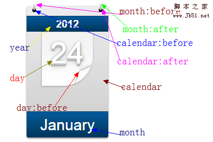 这个结构很简单,大家一看就清楚,在“div.calendar”标签中包含了三个“span”标签,分别放置的是“year”、“day”和“month”。
