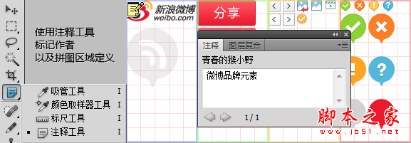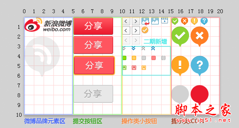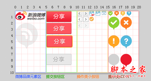 根据设计,我们了解在这个页面,需要将图片元素根据功能分为4个维度,即微博品牌展示元素、提交按钮、操作类小按钮、提示类ICON。于是我将画布 X轴坐标方向每5个格(其实完全可以10个格或者更多)划分为一个区域,每个这样一个区域的Y轴方向不再划分区域,这样做的目的是为了以后增加图标的扩展性。于是我们可以非常快速得到一个图标的坐标了。比如不可用的灰色的分享按钮 X坐标=5*20px=100px Y坐标=7*20px=140px; 那么我们就取得了这个图标的位置即background-position: -100px -140px。如果抽象成为公式的话,我们设置一个单元格的宽度为变量n。X坐标值Gx,Y坐标值Gy。那么画布中的元素css背景即为:background-position:-Gx*npx –Gy*npx 了。