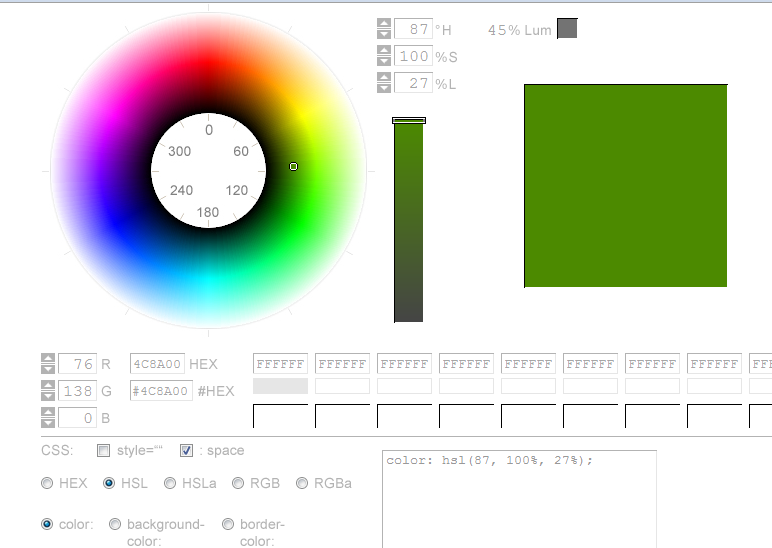 Tables Of Hue andSaturation Values,当然也还有其他的工具可以生成Hue的值,比如下面提到的HSL Color Picker在线工具。