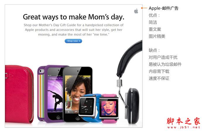 苹果的邮件广告,主题突出,一句话即说明这次活动的主旨:为母亲节挑选礼物。通过各种女性形象传达着"母亲节"的主题。