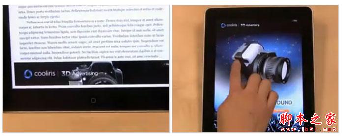 晃动iPad,下面banner中的相机会根据 iPad的晃动角度旋转不同视图,点击banner后全屏显示,手可以拖动相机360°旋转展示相机的各个角度。
