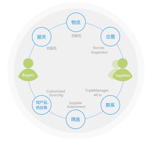分析用户需求之前,一起来看一下外贸B2B生意从工厂到发货的重要环节有哪些,Alibaba对应这些环节有哪些相关配套服务。