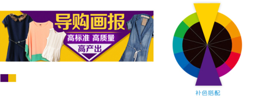 补色搭配:色环中相对的两个色相搭配。颜色对比强烈,传达能量、活力、兴奋等意思,补色中最好让一个颜色多,一个颜色少。如下图(紫色和黄色)。