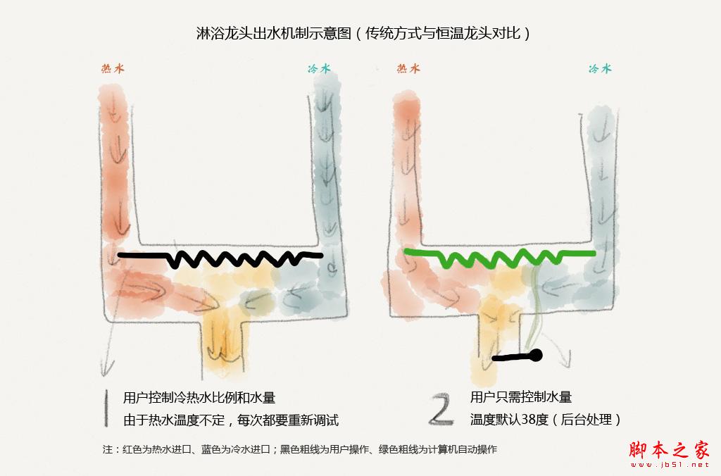 寒冷的冬日到陌生环境中往往会碰到水温调节,剧情一般是这样的:你调节到一个自认为合适的刻度,放了一段时间水后发现还是冷的,于是慢慢放大热水,几次调解后索性将热水开到最大,结果太烫,放大冷水,太冷,放小冷水,太烫,放小热水……最后合适了,咱们即使没有感冒也开始记恨这个淋浴器。比较合理的是一种叫 "恒温龙头"的产品,它给定一个用户不需要预设的默认水温:打开就是38度,这个值是我们洗澡的舒适点,不过你要是觉得冷了,顺时针变热,反之逆时针变冷,变热有阀值温度40度,这个温度以上会烫伤皮肤,实在想调高可以按住一个红色的预设按钮。所有的操作简单明了——大部分用户提起开关就可直接淋浴。