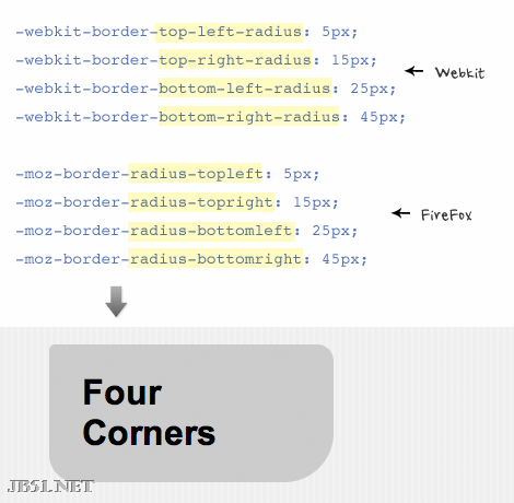 每个角都可以指定不同的宽度,注意每个角分开写时Webkit和Firefox的差异。