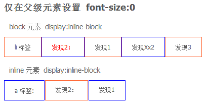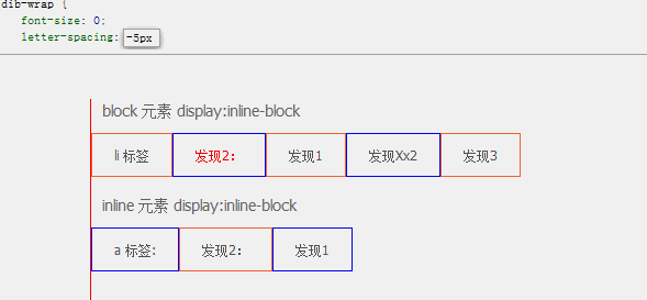 IE8 以上支持 font-size:0;IE6、7 inline 元素 inline-block 后设置 font-size:0 始终有 1px 的空隙。是不是一下子又开始头疼了?没关系,让我们请出 letter-spacing 和 word-spacing 二位大神。既然空白符也是字符,那么二位大神肯定是可以搞定它们的。