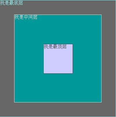 <div style="position:absolute; top:0; width:100px; height:100px; background:#CCF; margin:100px; color:#444; border:#444 1px solid">我是最顶层</div>