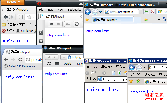 效果是一样了,但问题也跟着来了,就是大家所说的使用@import方式导入样式之后,会出现闪屏的情况,如果网速过慢样式过大导致页面被渲染延迟。这个情况到目前为止我似乎还真没碰到过,谁让我平时写页面的时候都是用link方式引入样式文件呢,罪过啊罪过,各位看官如果有兴趣的话,请自行尝试,这个不在本次测试范围内,但我相信这是有证可寻的。回归话题,目前这四个样式文件在各个浏览器中出现的情况是怎么样的呢,看下面的截图: