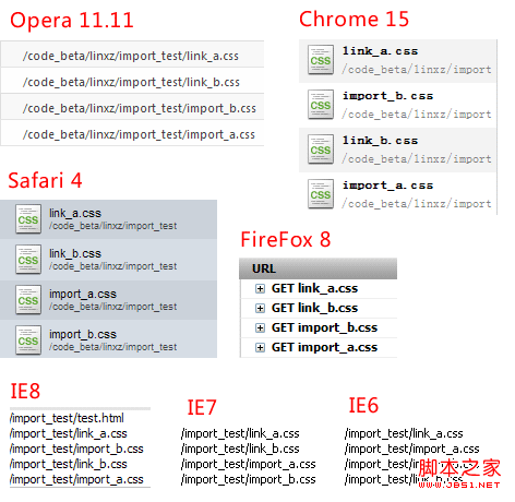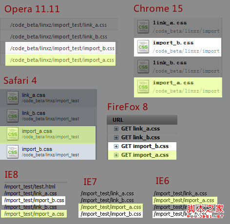 嗯,大概瞄了一下,似乎每个浏览器的表现还是存在着不少的差异,import_a.css和import_b.css出现的位置几乎没几个是相同的,再来一个图,这样或许会看得清晰一点,看不清楚那只能说明我不做设计是对的,看清楚的话,或许我可以考虑转行去做设计了。
