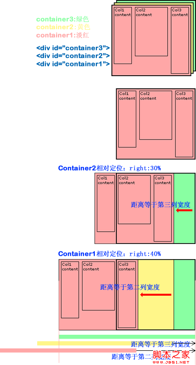 下图是实现上面的第二步对应的示例图,也就是容器“div.rightWrap”,“div.contentWrap”,“div.leftWrap”进行相对定位(position: releative),并展示了如何设置对应的“right”值。