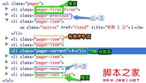 这样的结构是我常用来制作分页导航的结构,当然大家还有其他的不同结构,今天我们就不去探讨这方面的问题。其实这个结构很简单,我们把每一页的序号放在了一个“<a>”中,然后对应放在列表项中。唯一需要注意的一点就是“当前页”,因为所处当前页是不需要有具有点击效果,所以我直接将当前页放在一个“li”中,并且命名一个“pager-current”的类名给他,大家可以从Firebug的截图中来看这样的区别:
