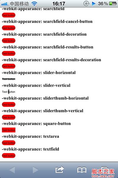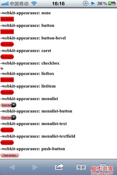效果图明显的告诉我们,在不同的“-webkit-appearance”选值情况下,button所渲染的效果是不一样的,详细的测试代码大家可使用safari浏览器点击这里。有关于“-webkit-appearance”的详细介绍,这回算是知道了,最后我建议大家,我们可以直接在“reset.css”样式文件中加处这么一句: