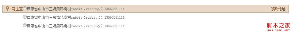 <li><span>寄送至</span><input type="radio" name="addr" />廣東省中山市三鄉鎮鴉崗村興隆製衣廠rabbit(rabbit收)13560351111<a href="#">修改地址</a></li>