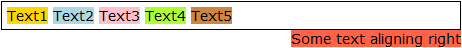 在 IE6 IE7 IE8(Q) 中,浮动的 SPAN 折行浮动在新的一行上,同时位置也脱离了其父容器;在其他浏览器中,则遵照 CSS 2.1 规范对浮动的定义,将浮动元素显示在浮动框另一边的第一个可用行上。在 IE6 IE7 下,测试代码没有达到我们预计的效果,右浮动的 SPAN 折行浮动在新的一行上,同时位置也脱离了其父容器。 现在看看 Text1、 Text2……Text5 所在的 SPAN 元素作为浮动框之前当前行的内容,应该显示在浮动框另一边的第一个可用行上。 右浮动的 SPAN 紧贴在其父容器的右边界,其左侧的空白区域只要有足够的空间容纳这 5 个非浮动的 SPAN 元素,它们就应该保持与右浮动的 SPAN 元素位于同一行上。 这里 IE6 IE7 以及所有版本 IE 的混杂模式的处理均是错误的。