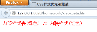 <div style="color:red;">内部样式表(绿色) VS 内联样式(红色)</div>