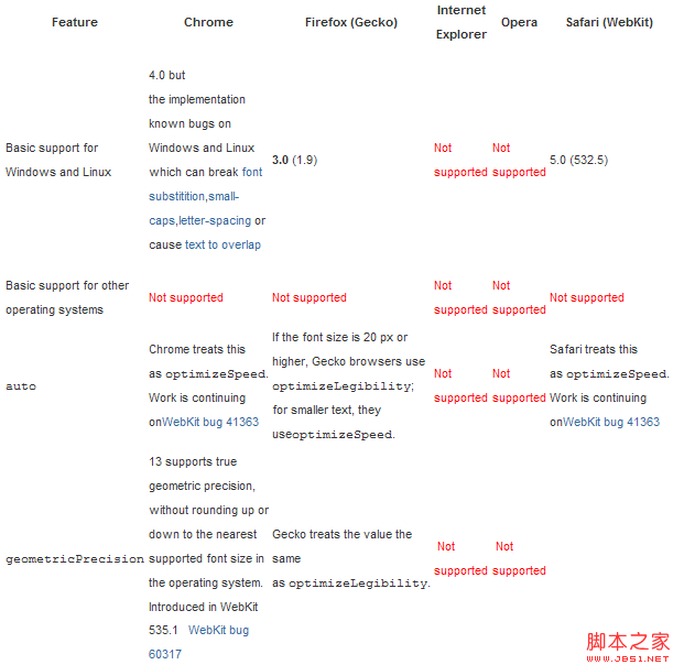 Gecko核心浏览器注意事项: 属性值设为auto时有个20px的渲染阈值,这个阈值可以通过更改偏好设置browser.display.auto_quality_min_font_size这一项。(对于Firefox,首先在浏览器键入about:config回车即可进入,更多更改配置选项的方法参见这里http://kb.mozillazine.org/Editing_configuration),如果你想了解更多有关mozilla preference- browser.display.auto_quality_min_font_size的介绍可以查看官方文档http://kb.mozillazine.org/Browser.display.auto_quality_min_font_size。