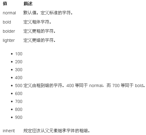 说明 该属性用于设置显示元素的文本中所用的字体加粗。数字值 400 相当于 关键字 normal,700 等价于 bold。每个数字值对应的字体加粗必须至少与下一个最小数字一样细,而且至少与下一个最大数字一样粗。