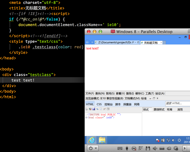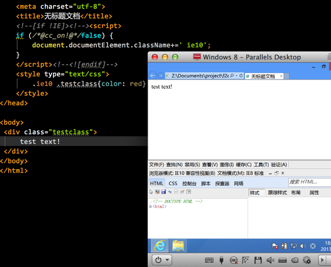 一、特性检测:@cc_on 我们可以用IE私有的条件编译(conditional compilation)结合条件注释来提供针对ie10的Hack:该脚本里面的IE排除条件注释,以确保IE6-9不承认它,然后它功能检测到了名为@ cc_on。