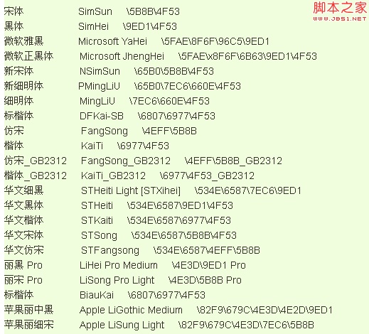 escape('微软雅黑');,然后会显示一个信息,%u5FAE%u8F6F%u96C5%u9ED1这个就是中文字体“微软雅黑”对应的Unicode编码“\5FAE\8F6F\96C5\9ED1”,注意把%u改成\,否则可能会出错。