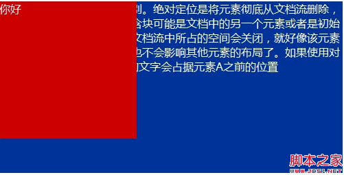绝对定位是将元素彻底从文档流删除,并相对于其包含块定位(包含块可能是文档中的另一个元素或者是初始包含块),元素原先在正常文档流中所占的空间会关闭,就好像该元素原来不存在一样,该元素再也不会影响其他元素的布局了。例如,对于上面的html片段,如果将元素A定位到左上角的话,元素B占据元素A之前的位置,与元素A重合在一起,并被元素A覆盖。CSS代码和效果图如下。