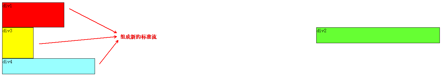 同理,由于div2、div3浮动,它们不再属于标准流,因此div4会自动上移,与div1组成一个“新”标准流,而浮动是漂浮在标准流之上,因此div2又挡住了div4。