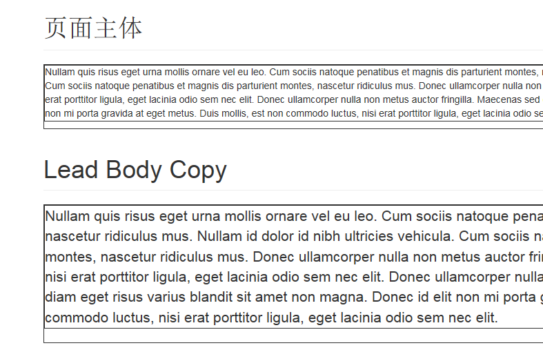 Bootstrap将全局font-size设置为14px,line-height为1.428 。这些属性直接赋给<body>和所有段落元素。另外,<p>(段落)还被设置了等于1/2行高的底部外边距(margin)(即10px)。
