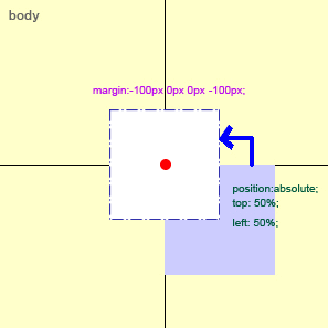 绝对定位的元素left设为50%时,是已左上角为原点的,所以只要再使用margin属性添加负值补偿回来即可。示例: