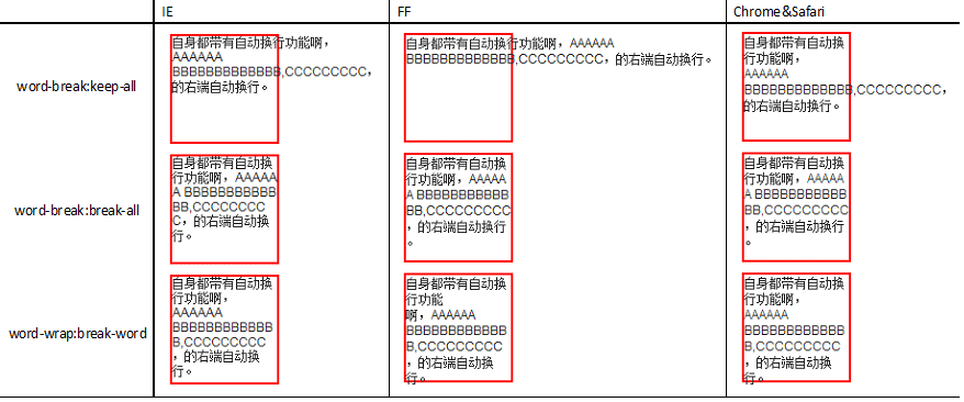Operanormal浏览器默认换行yesyesyesyeskeep-allCJK:不允许换行,non-CJK:与normal属性相同,IE中(对于CJK:在半空格、连接符或者任何标点符号处换行),chrome&safari不支持(使用默认换行)yesyesnoyesbreak-all允许单词内换行,IE(不允许标点符号位于行首),FF&Chrome&Safari(允许标点符号位于行首)yesyesyesyes