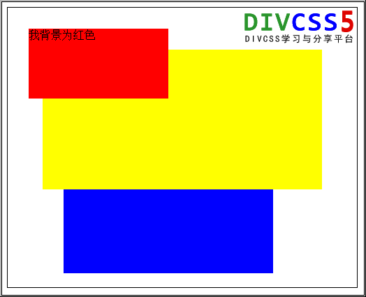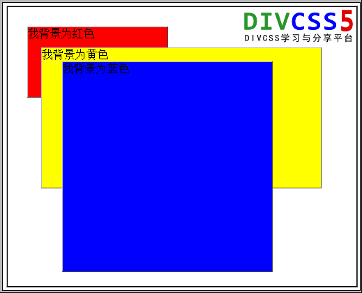 以上实例默认顺序是“.div-c”浮在最上层(蓝色背景层)、“.div-b”浮在中层(黄色背景层)、“.div-a”排最底层(红色背景层)。我们接下来使用z-index样式在不改变html代码情况下实现顺序颠覆,“.div-b”浮在中层(黄色背景层)排序不变,实现“.div-a”浮在最上层(红色背景层)、“.div-c”排最底层(蓝色背景层)。