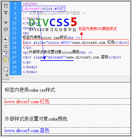 以上使用标签内使用color颜色样式和css代码使用color颜色样式。