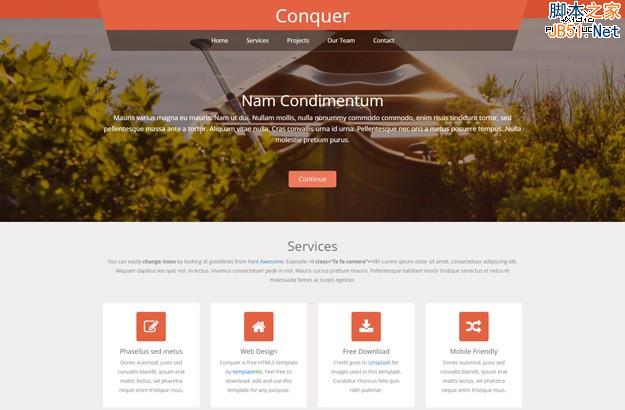 Conquer这款响应式网站模板基于Bootstrap V3.1.1来设计,适用于单页网站和滚动式布局。图片展示部分还包含了一个响应式图片展示工具lightbox。