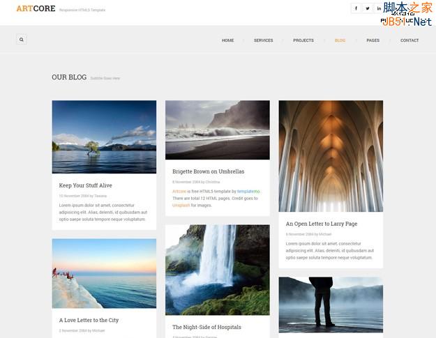 Artcore 是一款总计包括12个页面的响应式HTML5网页设计模板。首页采用了清爽的配色,并结合典型的瀑布流设计。项目展示部分可以使用单栏,双栏和三栏式布局。