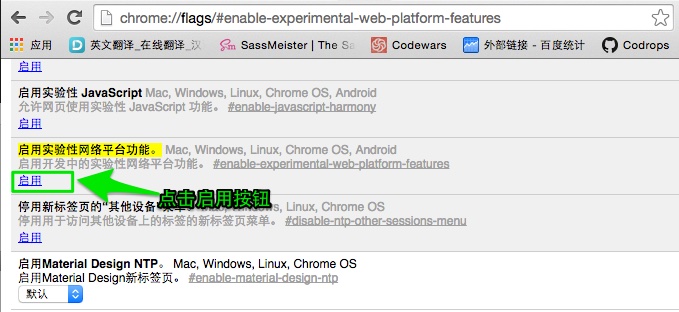 Chrome浏览器在写这篇文章的时候,我使用的Chrome浏览器版本是“Chrome 38.0.2125.101”。在Chrome浏览器中开启CSS Grid Layout模块功能比较简单,只需要在您的浏览器地址栏中输入:chrome://flags,回车后在列表清单中找到“启用实验性网络平台功能”(#enable-experimental-web-platform-features),一个更为简单的方法,可以直接在浏览器地址栏中输入网址:chrome://flags#enable-experimental-web-platform-features立马定位需要的选项,然后点击“启用”(enable)按钮,如下图所示: