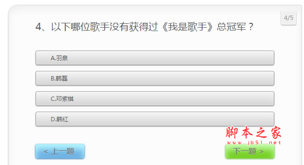用户答题后,将用户所答题的答案组成字符串如“1|2|4|1|3|”的形式,然后通过$.getJSON将答案给参数an提交到后台,后台PHP处理比对正确答案后,将比对结果返回过来,返回结果如:{"res":[1,0,1,1,0],"score":60},res是答题比对结果,分别表示五道题的答题结果,1表示答题正常,0表示答题错误,score表示得分。然后将返回的结果处理,得出每道题的评判结果和总得分,生成对应的html结构。
