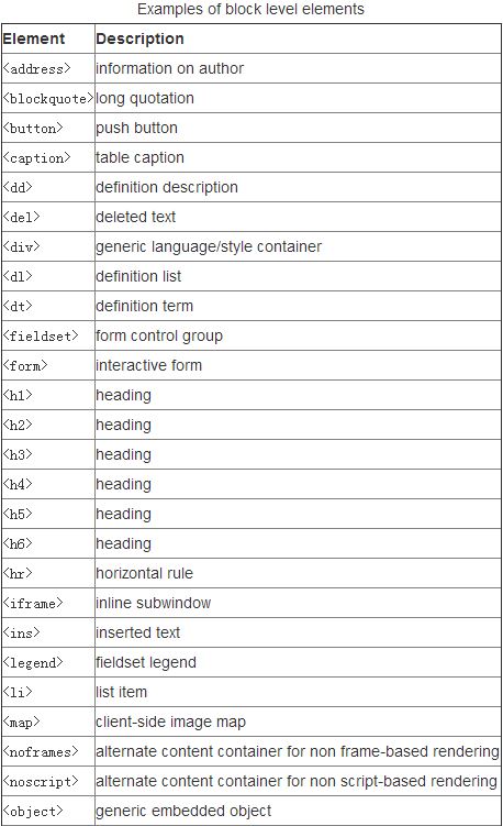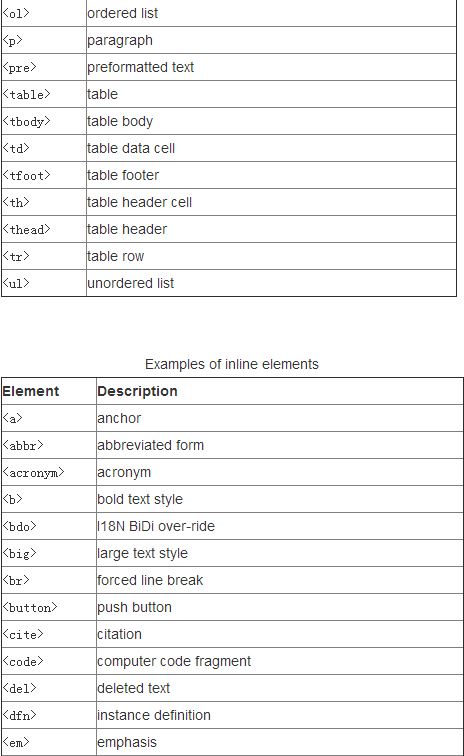 C:一般的块级元素诸如段落<p>、标题<h1><h2>...、列表,<ul><ol><li> 、表格<table>、表单<form>、DIV<div>和BODY<body>等元素。而内联元素则如:表单元素<input>、超级链接<a>、图像<img>、<span> ...
