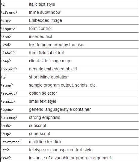 3、块级元素、行内元素分别汇总如下: