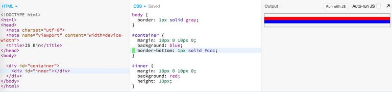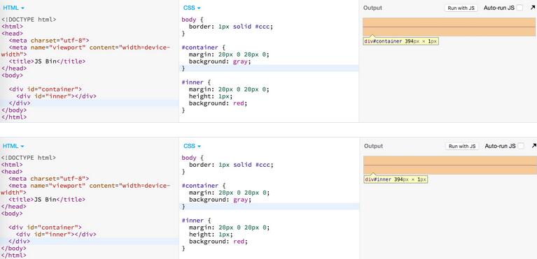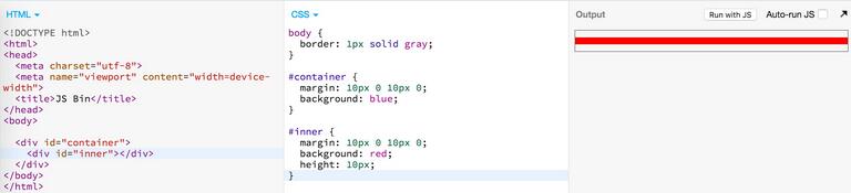 当给 #container 添加一个下边框,两个 margin 之间就边框的阻隔,他们就不相邻了,因此不能折叠。所以可以看到 #container 被撑开成了 20px,其中 10px 是 #inner 的高度,还有 10px 是 #inner 的 bottom margin,并且由于 margin 是透明的,因此 #container 露出了部分蓝色的背景。
