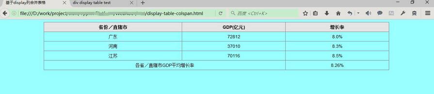 行合并的实现思路:与列合并的实现思路类似,将有单元格合并的列单独嵌套一个display为table的DIV,高度=单行高*单元格合并数目的倍数,同行的其他列同样均单独嵌套DIV,实例代码如下