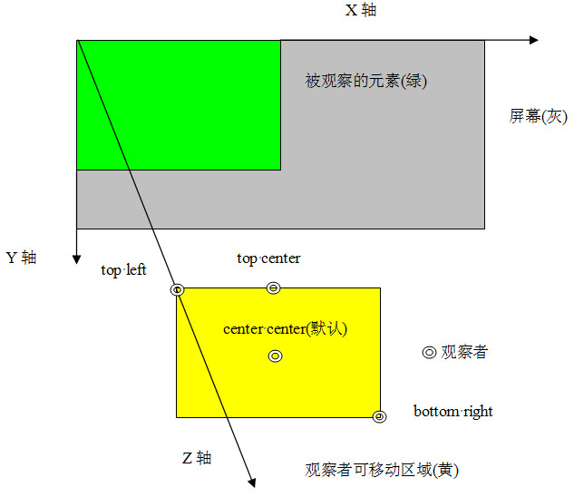 对于x轴和y轴来说,可以设置关键字和百分比,分别相对于其本身元素水平方向的宽度和垂直方向的高度和;z只能设置长度值