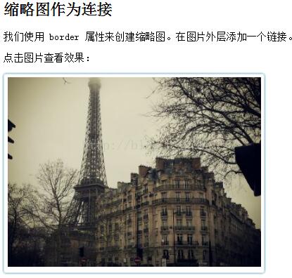 - <p>我们使用 border 属性来创建缩略图。在图片外层添加一个链接。</p>
