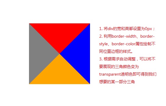 如上图所说,利用border边框属性,填充我们不想要的颜色为透明色,即可得到某一部分三角形,代码和图片效果如下。