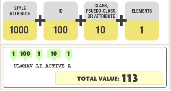 例如上图为例,其中#NAV为二等选择器,.ACTIVE为三等选择器,UL、LI和A为四等选择器。则整个选择器表达式的特殊性的值为1*100+1*10+3*1=113