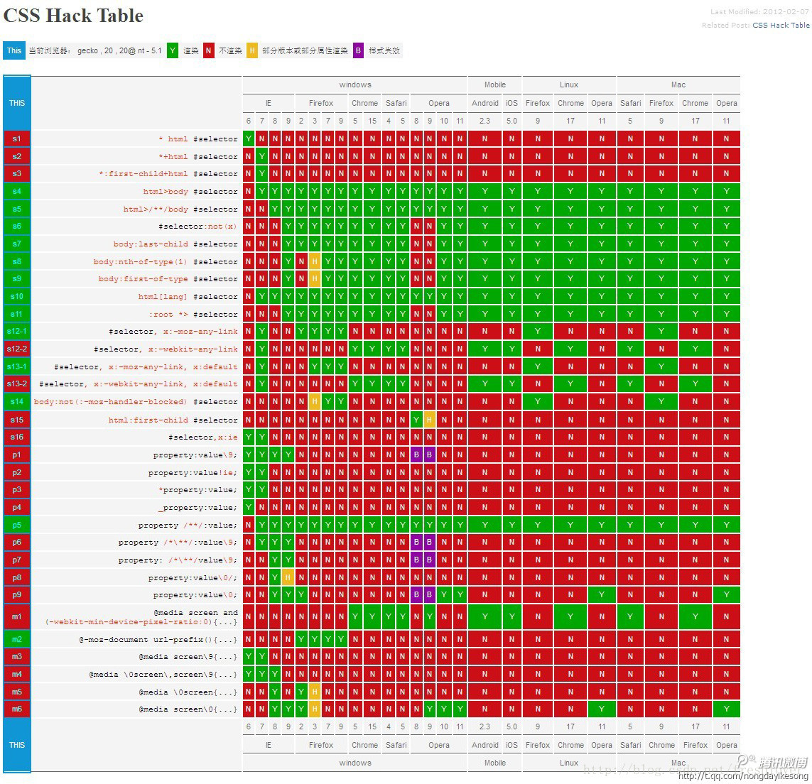 最后补上一张引自国外某大牛总结的CSS hack表,这时一张6年前的旧知识汇总表了,放在这里仅供需要时候方便参考。